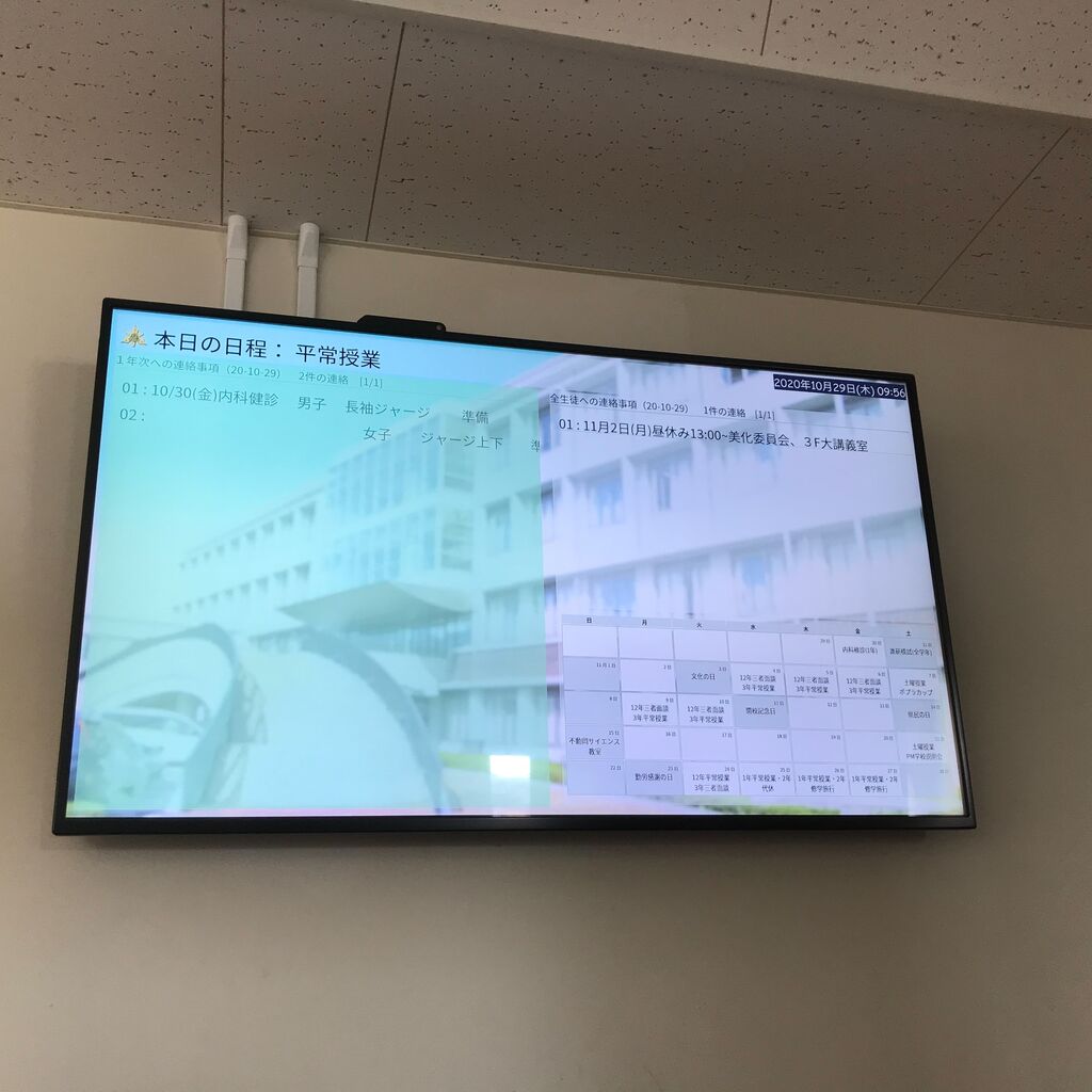 ◆廊下には学年別の連絡事項を表示したモニターが設置されていた。また,落書き用?のホワイトボードにも知性が滲み出ていた。